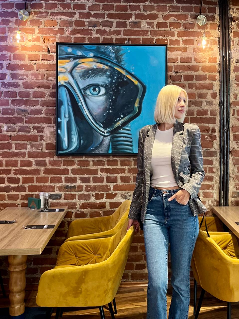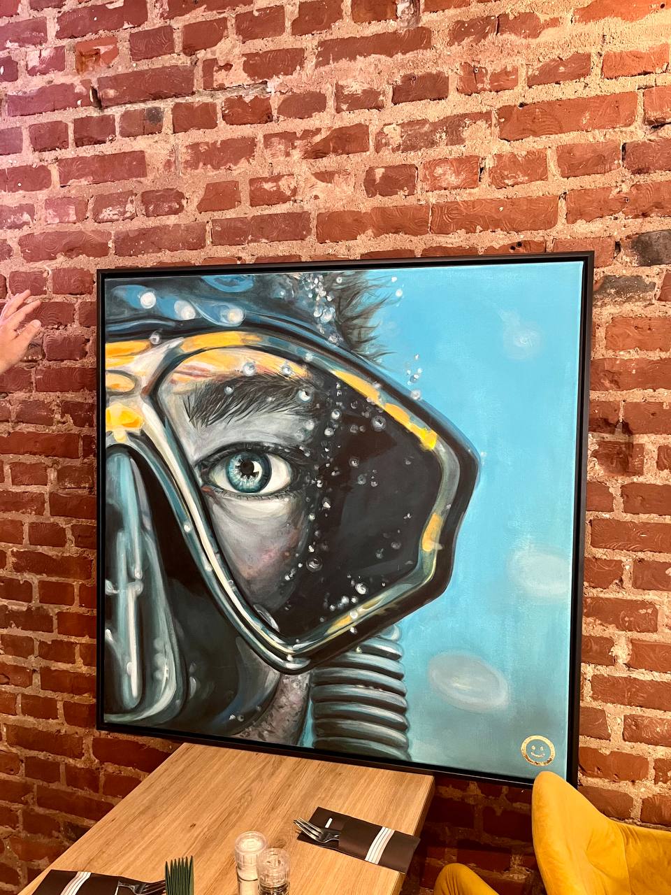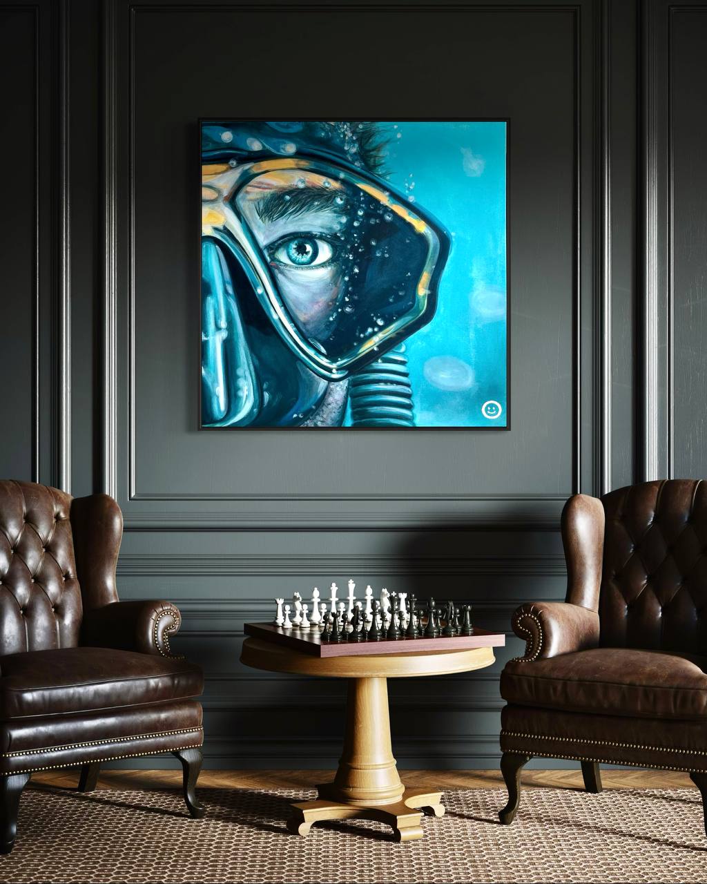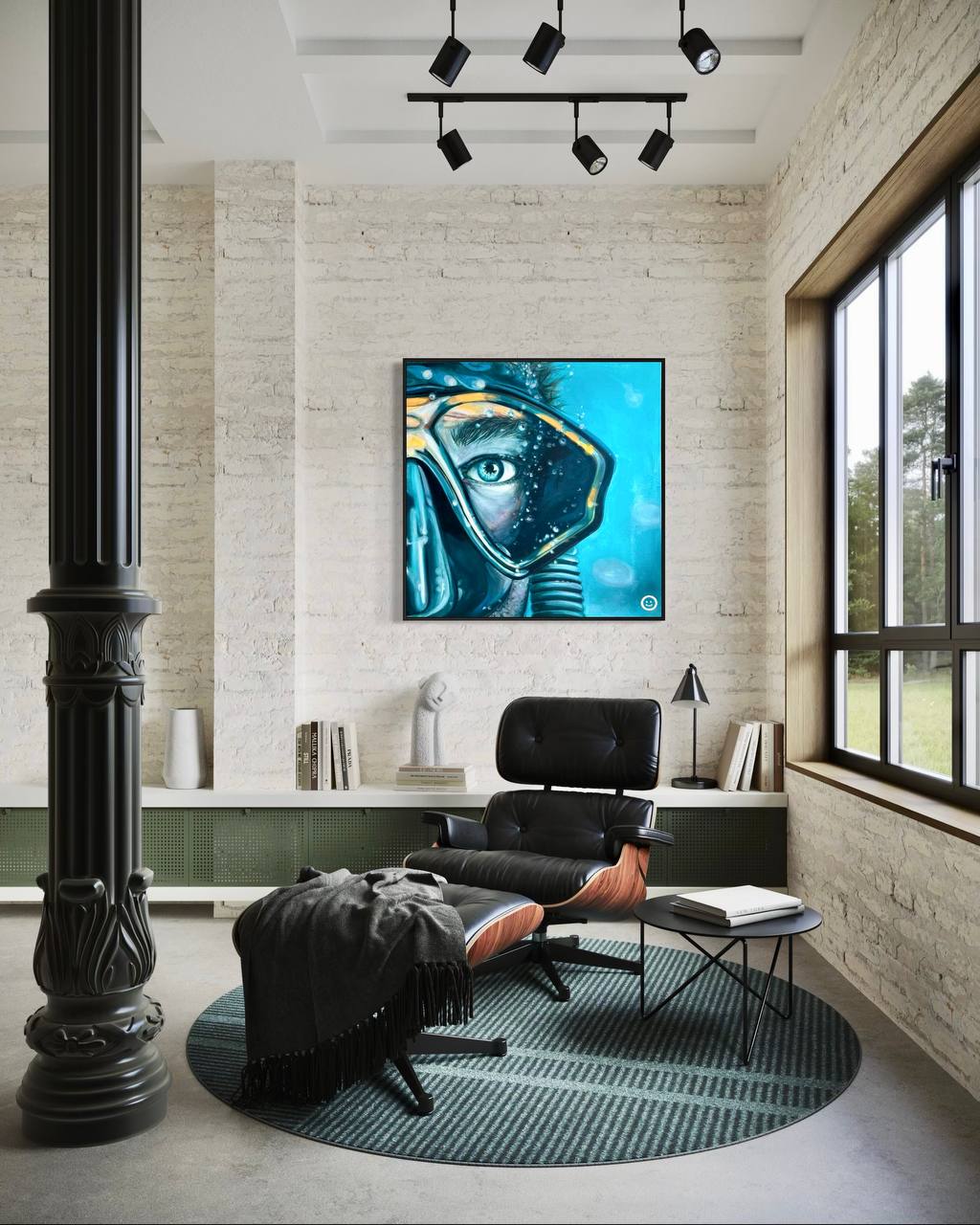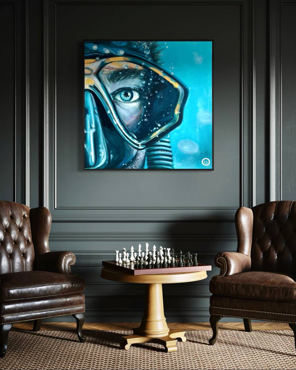 „DIE TIEFE IN UNS“ ist ein einzigartiges Acrylgemälde (100×100 cm) auf roher Leinwand, das einen Taucher in einer friedlichen, abstrakten Unterwasserlandschaft zeigt. Dieses Porträt fängt einen Moment der Einheit mit der Unterwasserwelt ein, in dem jeder Atemzug durch die Maske das Leben symbolisiert und der Blick durch das Glas zum Spiegel der Seele wird. Die Tiefe, die den Menschen umgibt und in ihm wohnt, verschmilzt miteinander und lädt den Betrachter dazu ein, über das eigene Wesen, die Zerbrechlichkeit und die Unendlichkeit der inneren Welt nachzudenken. Das Gemälde erinnert uns daran, die Oberfläche zu überwinden und Schönheit selbst an den unerwartetsten Orten zu entdecken.