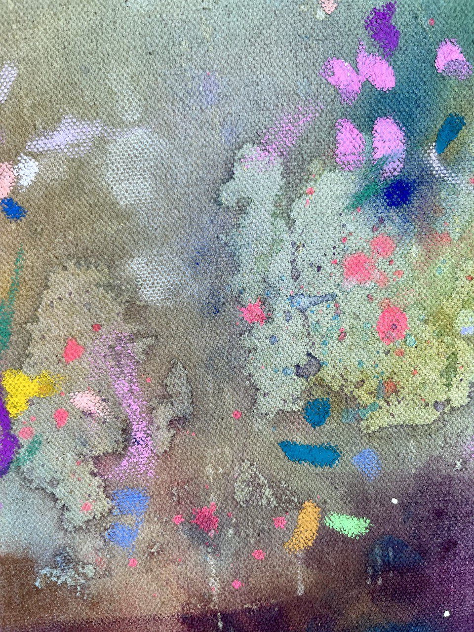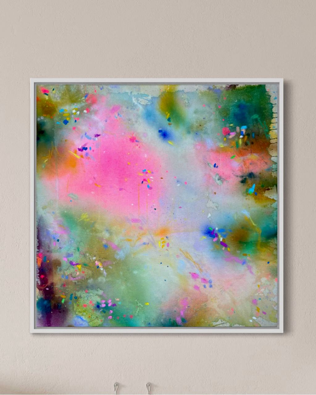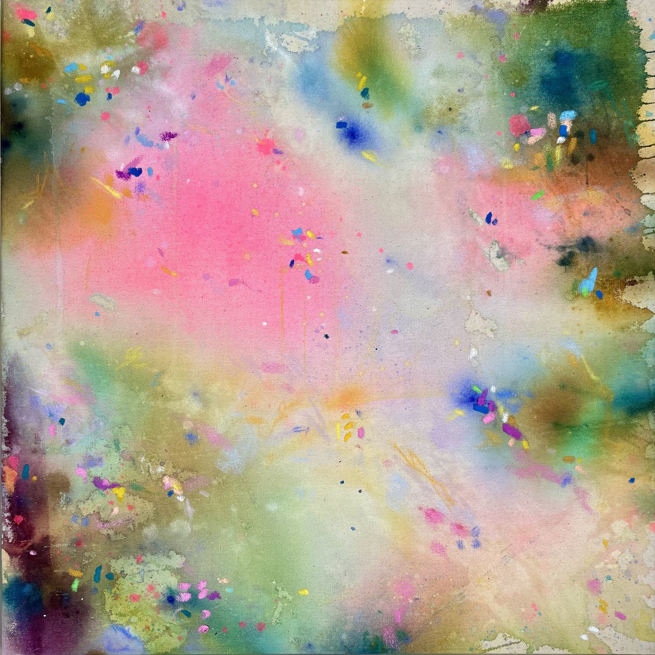 Handgemaltes buntes Wandbild in Acryl auf unbehandelter Leinwand. Größe 60 x 60 cm. Sanfte und lebendige Farbakzente in Rosa, Türkis, Ocker und Blau.