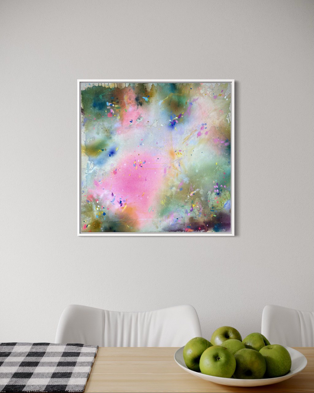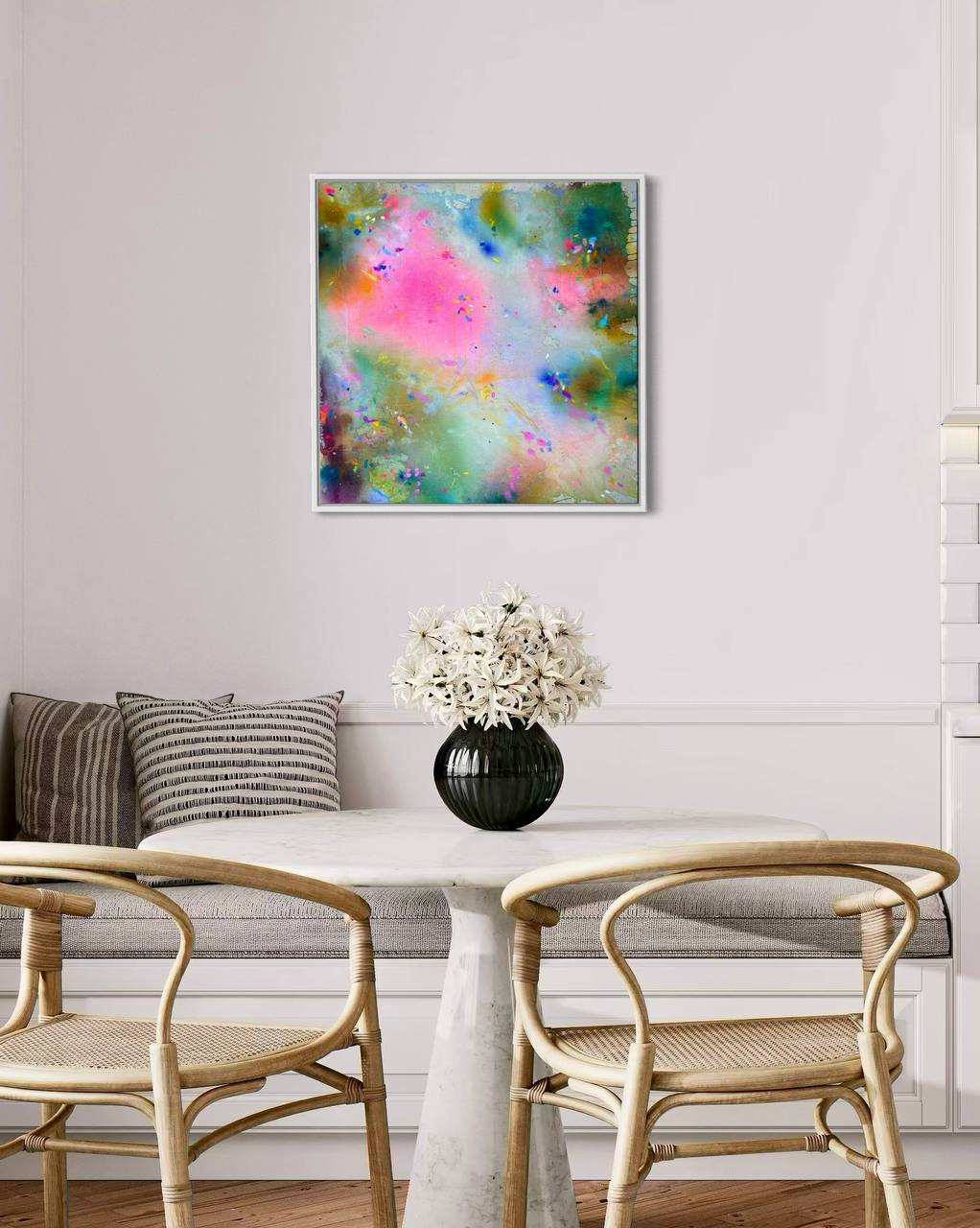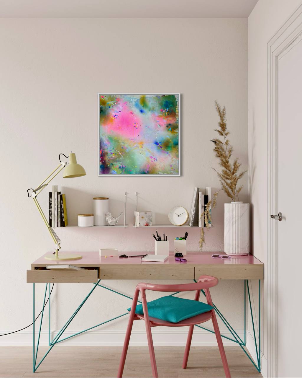 Die Leichtigkeit dieses Werkes lädt zum Innehalten ein. Ob im Kinderzimmer, in einer stilvollen Küche, einem meditativen Arbeitsbereich oder als ruhiger Akzent im Wohnzimmer – Gemini I bringt Farbe, Balance und Persönlichkeit in jeden Raum.