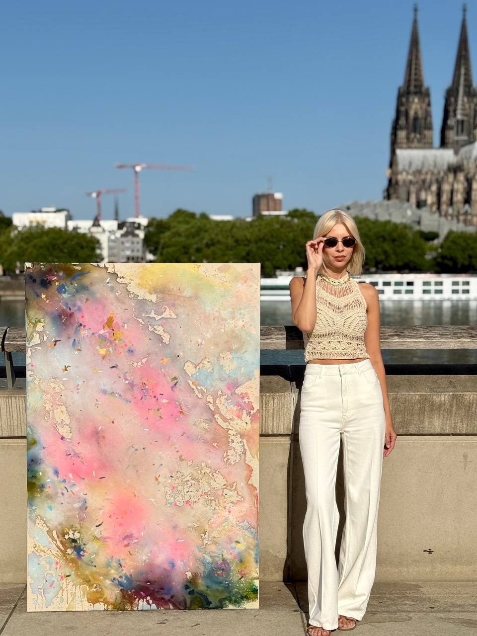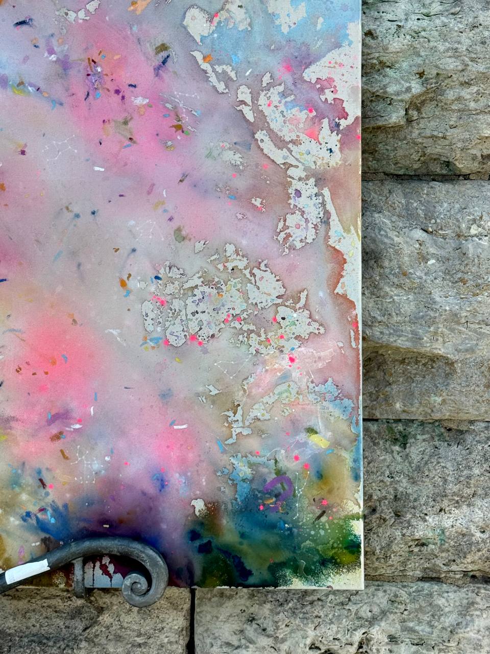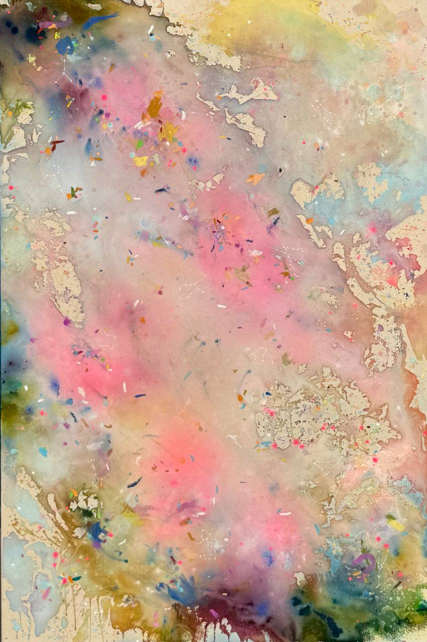 „ZODIACS“ ist ein großformatiges, handgemaltes abstraktes Gemälde in Pastelltönen. Rosa, Türkis, Ocker und dezente Beigetöne verschmelzen zu einem harmonischen Farbfeld, das Leichtigkeit und Stille ausstrahlt.